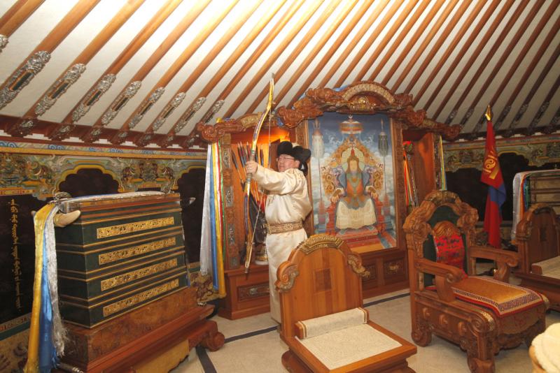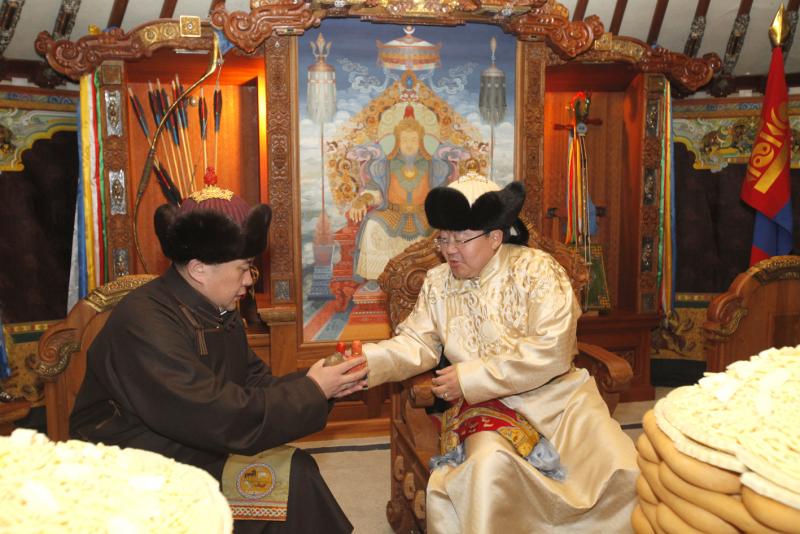 | Монгол Улсын Ерөнхийлөгч төрийн есөн хөлт цагаан туганд хүндэтгэл үзүүлж, Төрийн золголт хийв | ||