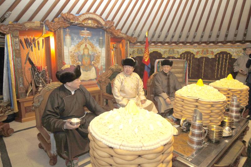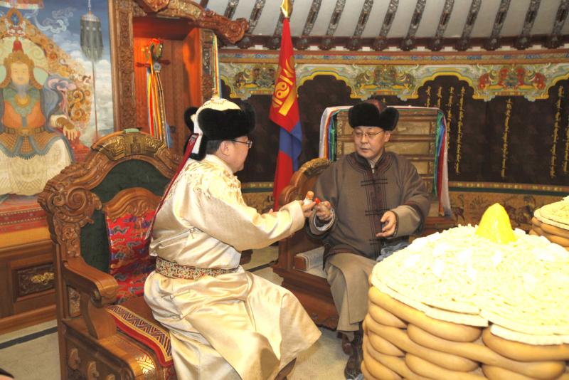 Үүний дараа Монголын бурхан шашинтны төв Гандантэгчинлэн хийдийн гавж Ё.Амгалан, Дашчойлин хийдийн тэргүүн хамба Ч.Дамбажав нар Төрийн хүндэтгэлийн өргөө гэрт морилон ирж Монгол Улсын Ерөнхийлөгч, УИХ-ын дарга, Монгол Улсын Ерөнхий сайд нарт бараалхан золгож, ирж буй улаагчин тахиа жилийн өнгийг хэлэлцэв. Хамба, гавж нар айлсан ирж байгаа гал улаагчин тахиа жилд монголчууд хийморь сүлд өөдөө, хөгжин бадрахын нигууртайг айлтгав.