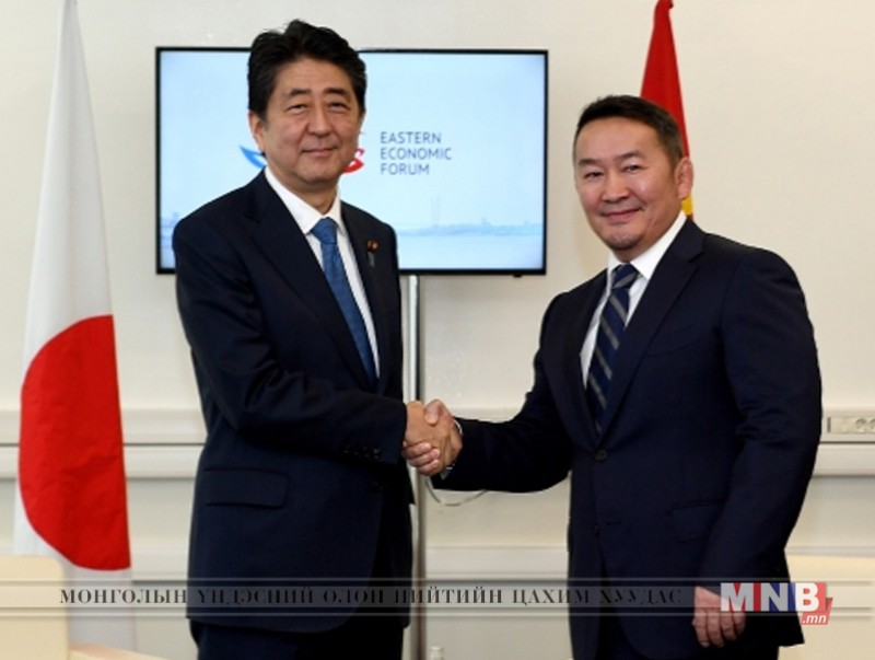 ОХУ-ын Владивосток хотод болж байгаа Дорнын эдийн засгийн форумд оролцож буй Монгол Улсын Ерөнхийлөгч Х.Баттулгад Япон Улсын Ерөнхий сайд Ш.Абэ өнөөдөр /2017.09.06/ бараалхав. Уулзалтад Монголын талаас Зам тээврийн хөгжлийн сайд Д.Ганбат, Монгол Улсын Ерөнхийлөгчийн Тамгын газрын дарга З.Энхболд, Гадаад харилцааны дэд сайд Б.Батцэцэг, Ерөнхийлөгчийн Монгол Улс, Япон Улсын хамтын ажиллагааны асуудал хариуцсан бие төлөөлөгч Д.Дагвадорж, Япон Улсын талаас Гадаад хэргийн сайд Т.Коно болон албаны бусад хүмүүс оролцлоо.