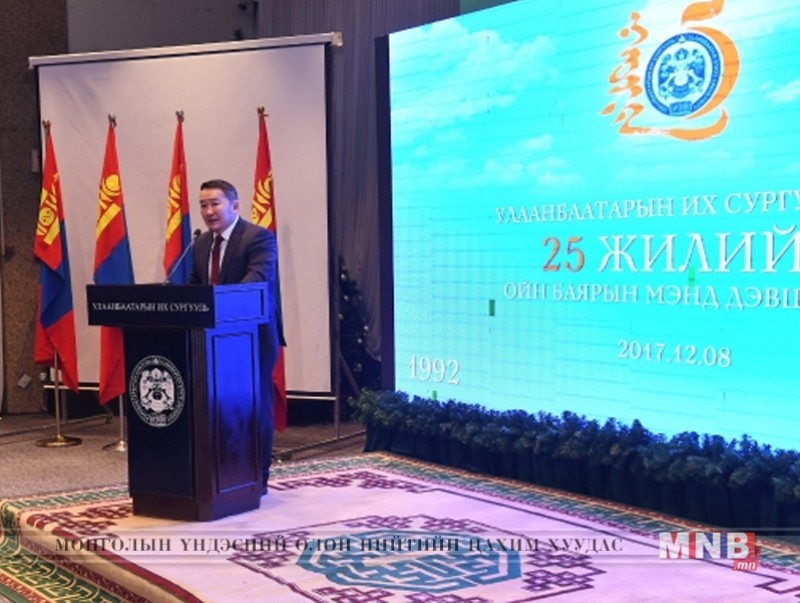 “Энд цугласан эрхэм хүндэт эрдэмтэн багш нар, оюутнууд, зочид төлөөлөгч та бүхэнд энэ өдрийн мэндийг хүргэе. Та бүхэнд Улаанбаатар их сургууль үүсэн байгуулагдсаны 25 жилийн ойн баярыг хүргэж, цаашдын сургалт, судалгаа, шинжилгээний ажилд улам их амжилт хүсэн ерөөе.