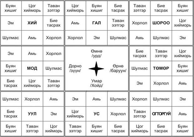Цог хийморийн зүгт Хишиг дуудуулах, бурхныг тайх, явах, суух, үйлнээ сайн.