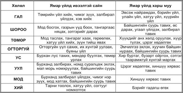 ГАЛ: Билгийн тооллоор 1, 9, 17, 25, 33, 41, 49, 57, 65, 73, 81, 89, 97, 105, 113 настай эрчүүд, 5, 13, 21, 29, 37, 45, 53, 61, 69, 77, 85, 93, 101, 109, 117 настай эмэгтэйчүүд буюу 1902, 1910, 1918, 1926, 1934, 1942, 1950, 1958, 1966, 1974, 1982, 1990, 1998, 2006, 2014 онуудад төрсөн эрэгтэйчүүд, 1906, 1914, 1922, 1930, 1938, 1946, 1954, 1962, 1970, 1978, 1986, 1994, 2002, 2010 онуудад төрсөн эмэгтэйчүүд зүүн урагш гараад, гал махбодын засал болгон, галаас гэмтэхгүй хэмээн сэтгэж, гал гаргаад (шүдэнз зурж хаях зэргээр) урдаас ирнэ. Гал хөлөл дээр суусан эрчүүд, эмэгтэйчүүд цагаан сарын шинийн нэгний өглөө “Ум базар дагий ний базар еэ мамаа бизаяа суухаа”