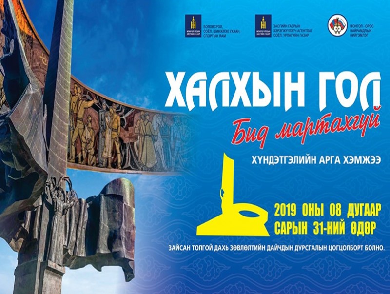 "Халхын гол-Бид мартахгүй" хүндэтгэлийн арга хэмжээ маргааш болно. БСШУСЯ, Засгийн газрын хэрэгжүүлэгч агентлаг Соёл, урлагийн газар, Монгол-Орос найрамдлын нийгэмлэгээс хамтран Халхын голын байлдааны ялалтад түүхэн үүрэг гүйцэтгэж, Монгол Улсын эрх чөлөө, тусгаар тогтнолыг бататган бэхжүүлэх үйлсэд үнэтэй хувь нэмэр оруулсан монгол, оросын эрэлхэг дайчдын гавьяаг мөнхжүүлэх, хойч үедээ таниулах зорилгоор "Халхын гол-Бид мартахгүй" хүндэтгэлийн арга хэмжээг наймдугаар сарын 31-нд Зайсан толгой дахь Зөвлөлтийн дайчдын дурсгалт цогцолборт зохион байгуулах гэж байна.