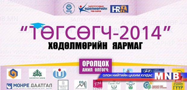 Их, дээд сургууль төгсөгчдийг ажилтай болгох зорилгоор “Төгсөгч-2014” хөдөлмөрийн яармагийг Монголын Залуучуудын Холбооноос зохион байгуулж байгаа юм. Энэхүү үзэсгэлэн яармагт 20 ажил олгогч байгууллага оролцож 250 гаруй нээлттэй ажлын байрыг танилцуулж байна. Хөдөлмөрийн яармагт оролцсон залуус банк, худалдаа үйлчилгээ, бүтээн байгуулалтын чиглэлээр байнгын болон түр ажлын байранд зуучлуулах боломжтой гэдгийг зохион байгуулагчид нь хэлж байна. Үзэсгэлэн өнөөдөр 17:00 цаг хүртэл үргэлжилнэ.