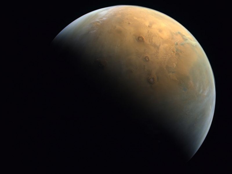 Улаан нүдэн гарагийн хойд туйл болон тус гарагийн хамгийн том галт уул болох Олимпус Монс энэхүү зурган дээрээс тодорхой харагдах юм. "Итгэл" сансрын судалгааны авсан Ангарагийн анхны зургийг АНЭУ-ын сансрын судалгааны агентлаг албан ёсоор нийтэлсэн байна.