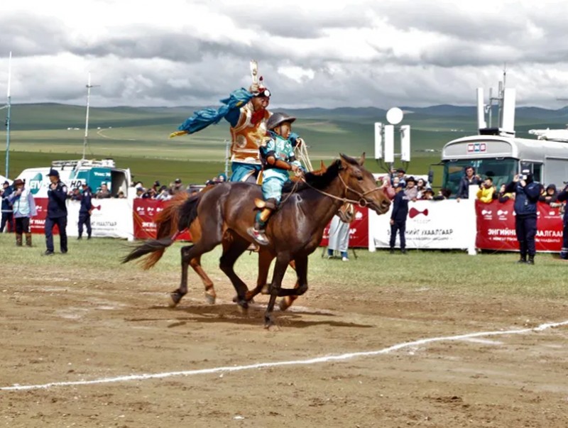 Улсын баяр наадмын хурдан соёолонгийн уралдаанд Ховд аймгийн Мянгад сумын уяач Батсуурийн Энхбаярын халтар (Уралдаанч Батсүхийн Намжилцогт, 11 настай, эрэгтэй) хурдалж, наадамчин олноо баясгалаа.