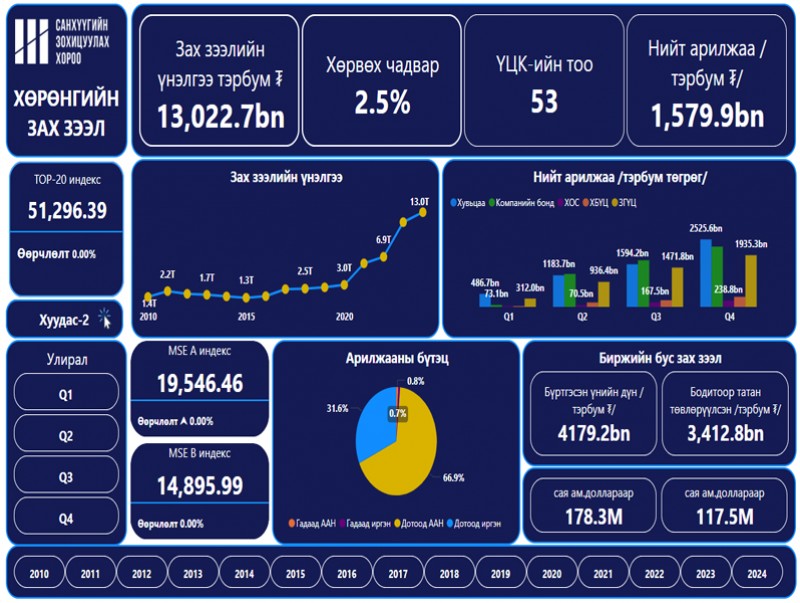 Энэхүү дашбоард нь хөрөнгийн зах зээл, банк бус санхүүгийн байгууллага, даатгал, хадгаламж зээлийн хоршоо, үл хөдлөх эд хөрөнгө зуучлал, үнэт металл, үнэт чулууны арилжаа эрхлэгчдийн салбар, сэндбоксын зохицуулалтын орчин болон виртуал хөрөнгийн үйлчилгээ үзүүлэгчийн салбарын улирлын тоон үзүүлэлтүүдийг нэгтгэн цаг хугацааны эрэмбээр харуулах тул та бүхэн сонирхсон салбарын мэдээллээ он, улирлаар нь сонгож авах боломжтой.
