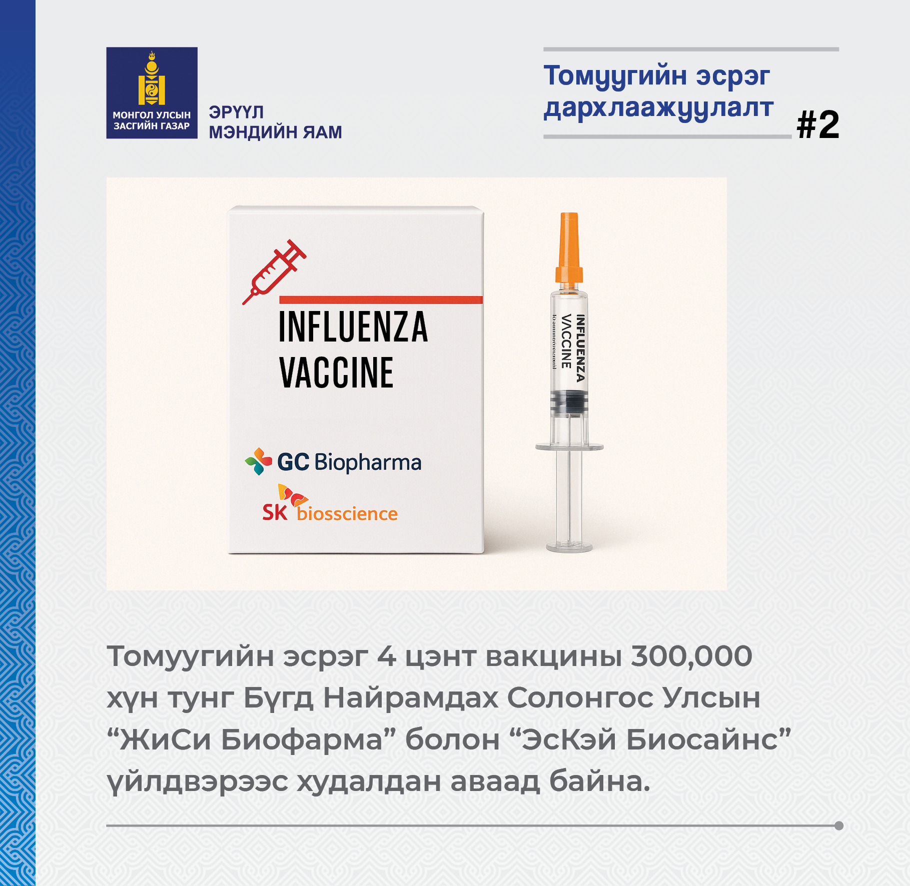 Энэ жил ДЭМБ-аас зөвлөмж болгосон томуугийн А хүрээний 2 хэв шинж, В хүрээний 2 хэв шинжийг агуулсан БНСУ-д үйлдвэрлэсэн 300,000 хүн тун 4 цэнт вакцинаар эрсдэлт бүлгийн хүн амыг дархлаажуулж байна.