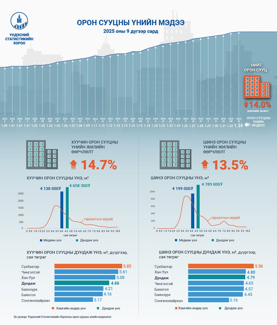Шинэ орон сууцны үнэ өмнөх оны мөн үеэс 13.5 хувиар, өмнөх сараас 1.1 хувиар, хуучин орон сууцны үнэ өмнөх оны мөн үеэс 14.7 хувиар, өмнөх сараас 1.3 хувиар тус тус өссөн байна гэж Үндэсний Статистикийн Хорооноос мэдээллээ.