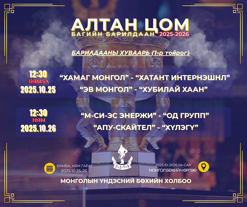 Монголын Үндэсний бөхийн холбооны “Алтан цом 2025” барилдаанд Үндэсний шилдэг 8 компанийн баг өрсөлдөнө. Баг тус бүр 8 гишүүнтэй байх бөгөөд 3 гишүүнийг сонгож, үлдсэн 5 бөхөө сугалаагаар тодруулсан.