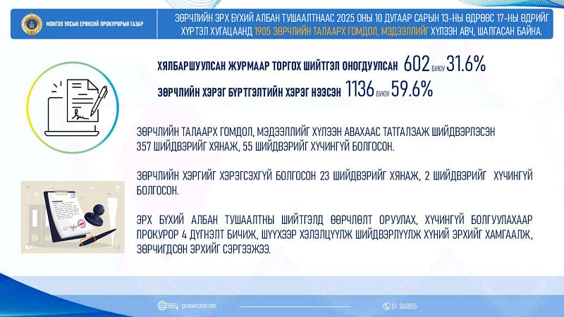 Прокурорын байгууллага 2025 оны 10 дугаар сарын 13-ны өдрөөс 17-ны өдрийг хүртэл хугацаанд улсын хэмжээнд зөрчил шалган шийдвэрлэх эрх бүхий албан тушаалтан 1,905 зөрчлийн талаарх гомдол, мэдээллийг хүлээн авч, шалгасан байна.