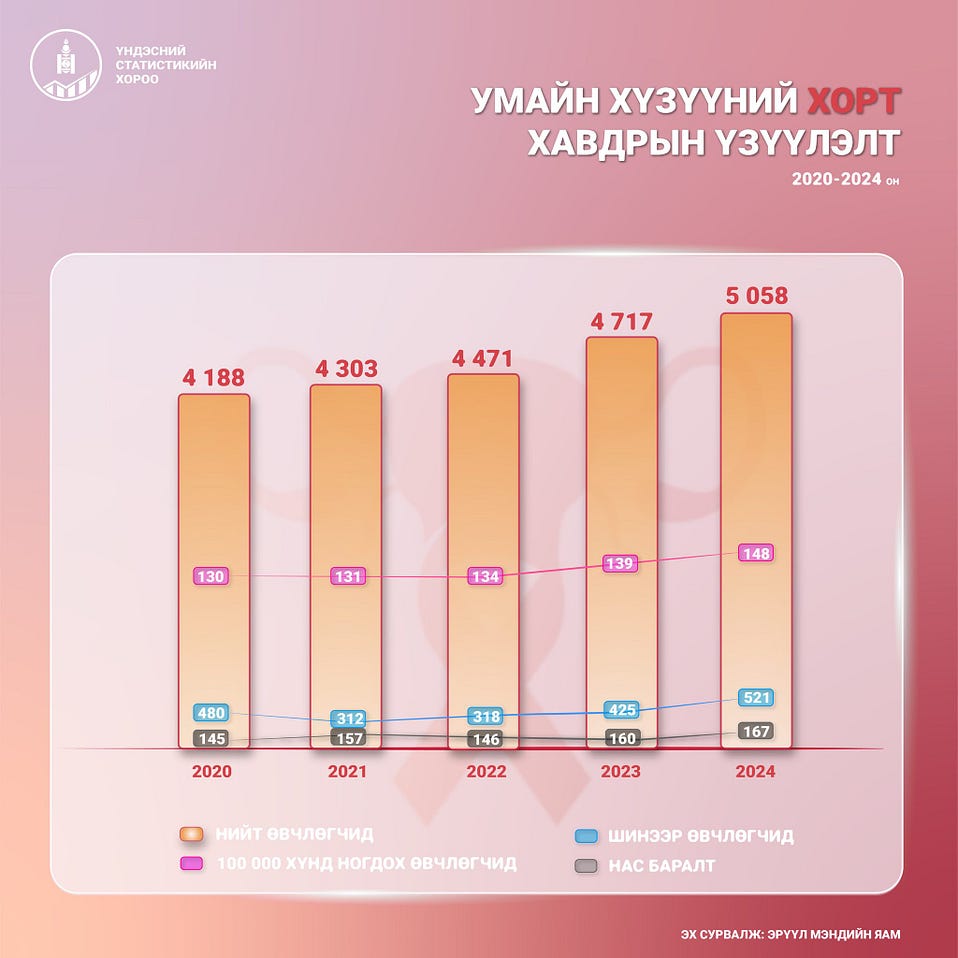 Эрүүл мэндийн яамны мэдээллээр 2024 оны байдлаар улсын хэмжээнд умайн хүзүүний хорт хавдраар 5058 хүн өвчилснөөс сүүлийн нэг жилд 521 хүн шинээр оношлогджээ.