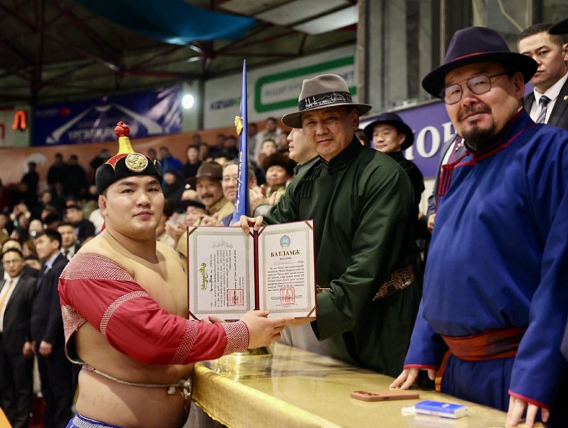 Монгол Улсын Ерөнхийлөгч Ухнаагийн Хүрэлсүх Улсын арслан Э.Батмагнайд Монгол Улсын Ерөнхийлөгчийн нэрэмжит “Чингис хаан” цомыг гардуулж, баяр хүргэлээ.