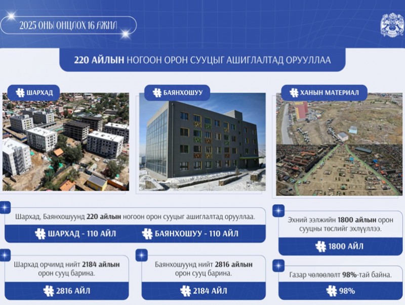 Түүнчлэн Баянхошуу хот орон сууцжуулах төслийн хүрээнд Баянхошуу, Шархад дэд төвүүдэд Азийн хөгжлийн банк, Уур амьсгалын ногоон сангийн санхүүжилтээр ногоон орон сууц барьж байна. Тодруулбал, Баянхошууны 41.3 га талбайд нийт 2816 айлын орон сууц, Шархадны 19.2 га талбайд 2184 айлын орон сууц барихаар үе шаттай ажлыг эхлүүллээ. Ийнхүү энэ онд Баянхошуу, Шархад орчимд тус бүр 110 айлын ногоон орон сууцыг ашиглалтад орууллаа. Ногоон орон сууцыг барьснаар гэр хорооллын бүсэд орон сууц, зам, инженерийн шугам сүлжээг нэвтрүүлж, эрчим хүчний ухаалаг хэрэглээ, байгаль орчинд ээлтэй, тогтвортой амьдрах орчны шинэ загвар бий болгохыг зорьж буй. Мөн Сонгинохайрхан дүүргийн 34 дүгээр хороо, Баянголын амны 10 га талбайд 2007 айлын орон сууцны хорооллыг барьж байна.