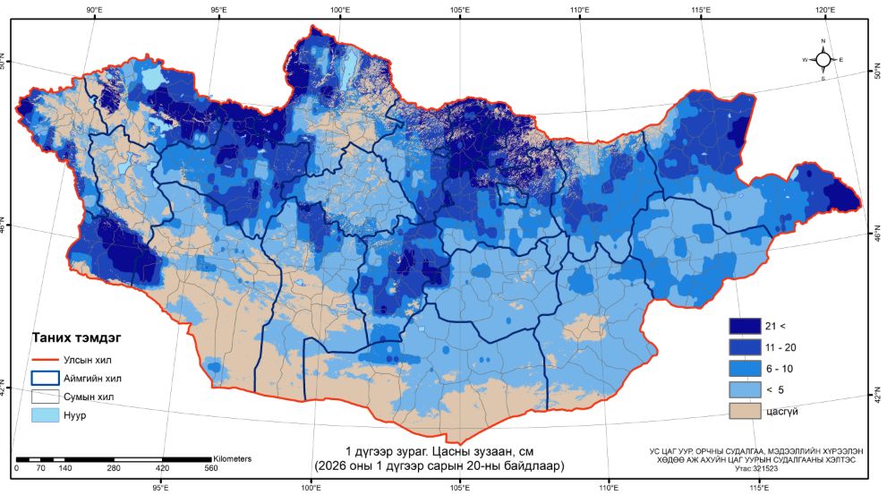 Цаг уурын байгууллагаас гаргадаг арав хоногт нэг удаа хийдэг хээрийн цасны хэмжилтийн мэдээгээр нэгдүгээр сарын 20-ны байдлаар нийт нутгийн 87 хувьд цастай байна.