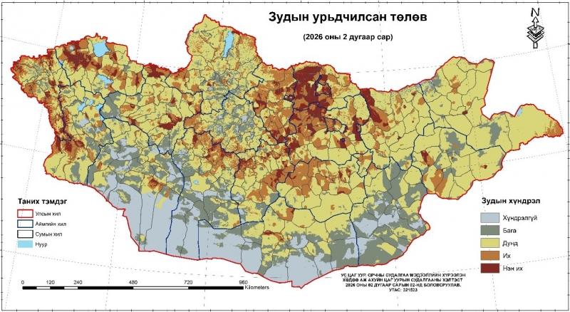 Хоёрдугаар сарын зудын урьдчилсан төлөвөөс харахад, мал өвөлжилт нийт нутгийн 5 хувьд нэн их, 16 хувьд их, 50 хувьд дунд, 17 хувьд бага зэрэг хүндрэлтэй, 11 хувьд хүндрэлгүй байхаар байна.
