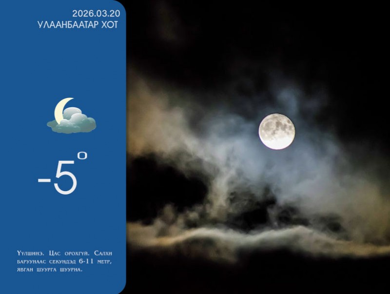 УЛААНБААТАР ХОТ ОРЧМООР: Үүлшинэ. Шөнөдөө цас орохгүй. Өдөртөө ялимгүй хур тунадас орно. Салхи шөнөдөө баруунаас, өдөртөө баруун өмнөөс баруун хойш эргэж секундэд 6-11 метр, явган шуурга шуурна. Шөнөдөө Яармаг-Сонгины орчмоор 6-8 хэм, бусад хэсгээр 3-5 хэм хүйтэн, өдөртөө 1-3 хэм дулаан байна.