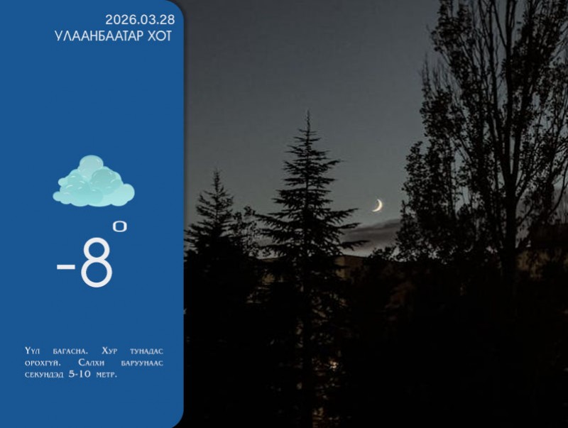 УЛААНБААТАР ХОТ ОРЧМООР: Шөнөдөө үүл багасна, өдөртөө их төлөв цэлмэг. Хур тунадас орохгүй. Салхи баруунаас секундэд 5-10 метр. Шөнөдөө Яармаг-Сонгины орчмоор 12-14 хэм, бусад хэсгээр 6-8 хэм хүйтэн, өдөртөө 5-7 хэм дулаан байна.