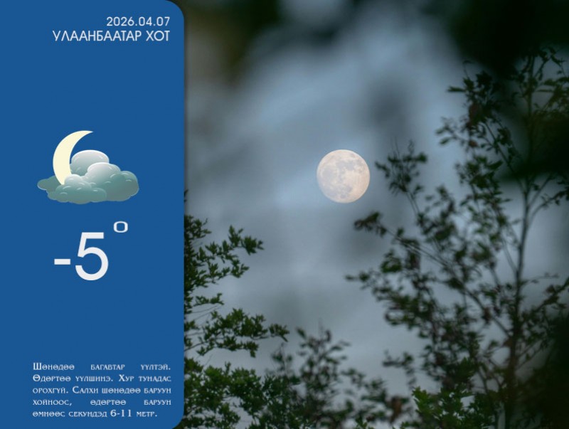 УЛААНБААТАР ХОТ ОРЧМООР: Шөнөдөө багавтар үүлтэй. Өдөртөө үүлшинэ. Хур тунадас орохгүй. Салхи шөнөдөө баруун хойноос, өдөртөө баруун өмнөөс секундэд 6-11 метр. Шөнөдөө 3-5 хэм, өдөртөө 13-15 хэм дулаан байна.
