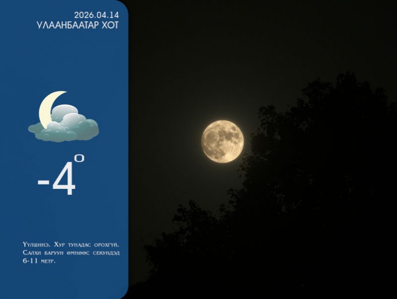 УЛААНБААТАР ХОТ ОРЧМООР: Үүлшинэ. Хур тунадас орохгүй. Салхи баруун өмнөөс секундэд 6-11 метр. Шөнөдөө 2-4 хэм хүйтэн, өдөртөө 11-13 хэм дулаан байна.