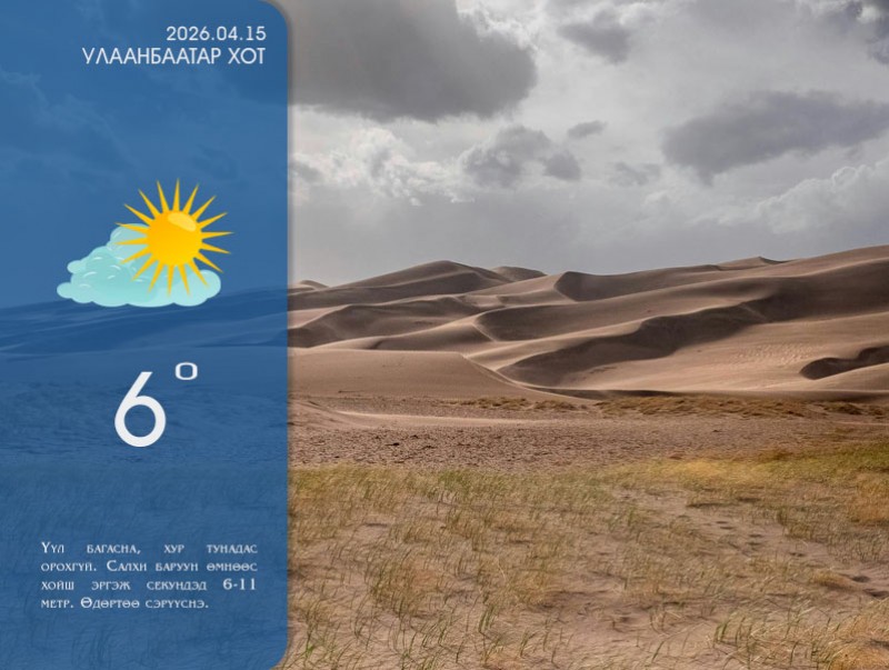 2026 оны дөрөвдүгээр сарын 15-ны 08 цагаас 20 цаг хүртэл: Ихэнх нутгаар солигдмол үүлтэй. Төвийн аймгуудын нутгийн зарим газар, зүүн аймгуудын нутгийн хойд хэсгээр бороо, нойтон цас, цас орж, цасан шуурга шуурна. Бусад нутгаар хур тунадас орохгүй. Салхи говь болон зүүн аймгуудын нутгаар баруун өмнөөс баруун хойш эргэж, бусад нутгаар баруунаас секундэд 6-11 метр, Алтайн уулархаг нутаг болон говь, тал, хээрийн нутгаар түр зуур секундэд 18-20 метр хүрч ширүүсэж, шороон шуурга шуурна. Ихэнх нутгаар сэрүүсэж, Увс нуур болон Дархадын хотгор, Монгол-Алтай, Хангай, Хөвсгөл, Хэнтийн уулархаг нутаг, Завхан голын эх, Идэр, Тэс, Туул, Тэрэлж, Хэрлэн голын хөндийгөөр 1-6 хэм, говийн бүс нутгийн зүүн өмнөд хэсгээр 17-22 хэм, говийн бүс нутгийн баруун өмнөд хэсгээр 12-17 хэм, бусад нутгаар 6-11 хэм дулаан байна.
