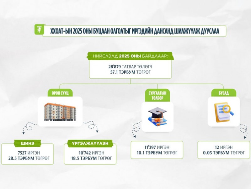 2025 оны хөнгөлөлт буцаан олголтыг иргэдийн дансанд энэ сарын 20-ноос шилжүүлж эхэлсэн бөгөөд өнөөдөр шилжүүлж дууслаа. 2025 оны жилийн эцсийн тайлангаар 28,879 татвар төлөгч иргэн 57.1 тэрбум төгрөгийн буцаан олголтыг авахаар тайлангаа ирүүлсэн юм. Тодруулбал, шинээр орон сууц худалдан аваад анх удаа хөнгөлөлт чөлөөлөлтөд хамрагдаж байгаа 7,527 иргэнд 28.5 тэрбум төгрөг, үргэлжлүүлэн хамрагдаж байгаа 10,742 иргэнд 18.5 тэрбум төгрөг, сургалтын төлбөрийн хөнгөлөлтөд хамрагдаж байгаа 11,397 иргэнд 10.1 тэрбум төгрөг, хуульд заагдсан бусад нөхцөлөөр 12 иргэнд 30 орчим сая төгрөгийн буцаан олголтыг олголоо.