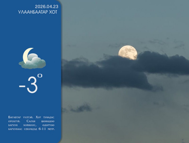 УЛААНБААТАР ХОТ ОРЧМООР: Багавтар үүлтэй. Хур тунадас орохгүй. Салхи шөнөдөө баруун хойноос, өдөртөө баруунаас секундэд 6-11 метр. Шөнөдөө 1-3 хэм хүйтэн, өдөртөө 16-18 хэм дулаан байна.