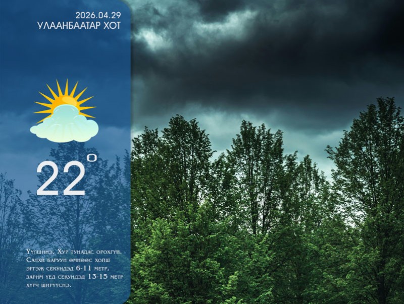 2026 оны дөрөвдүгээр сарын 29-ний 08 цагаас 20 цаг хүртэл: Нутгийн баруун хагаст үүлэрхэг. Баруун аймгуудын нутгийн өмнөд болон зүүн, төвийн аймгуудын нутгийн баруун болон хойд хэсгээр бороо, нойтон цас, уулаараа цас орж, цасан шуурга шуурна. Бусад нутгаар багавтар үүлтэй, хур тунадас орохгүй. Салхи нутгийн баруун хагаст баруун өмнөөс хойш эргэж, бусад нутгаар баруунаас секундэд 6-11 метр, нутгийн зарим газраар секундэд 14-16 метр хүрч ширүүсэж, шороон шуурга шуурна.