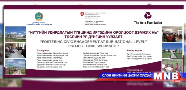 “Нутгийн удирдлагын түвшинд иргэдийн оролцоог дэмжих нь” хөтөлбөрийг Швейцарийн Хөгжлийн агентлагын санхүүжилтээр нийт 17 сум,нийслэл Улаанбаатар хотын 3 хороонд хэрэгжүүлсэн юм. Хөтөлбөрийн зорилго нь нутгийн удирдлагын ил тод, хариуцлагатай байдлыг нэмэгдүүлэх, иргэдийн хэрэгцээнд нийцсэн бодлого боловсруулах үйл ажиллагаа, иргэдэд хандсан үйлчилгээг сайжруулахад хувь нэмрээ оруулах, Монгол Улсын Ерөнхийлөгчийн зүгээс дэвшүүлсэн шууд ардчилал болон санхүүгийн төвлөрлийг бууруулах зорилгыг дэмжих явдал байв. Монгол улсын Ерөнхийлөгчийн зөвлөх Л.Дашдорж “Иргэдийн оролцоог дэмжих төсөл нь хамаарах хууль тогтоомжуудын талаарх иргэдийн мэдлэгийг ихээр нэмэгдүүлэхийн зэрэгцээ бодлого боловсруулахад иргэдийн оролцоог идэвхжүүлэх үйл явцыг төлөвшүүлэн бий болгосон” хэмээн дүгнэлээ.