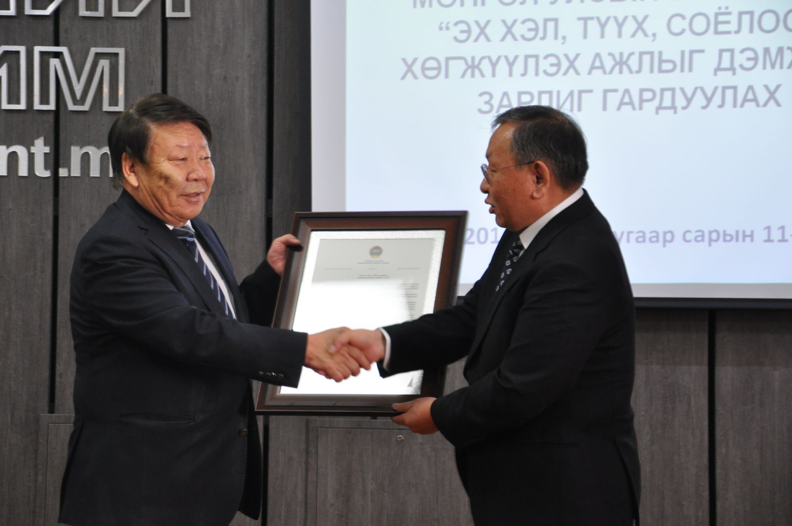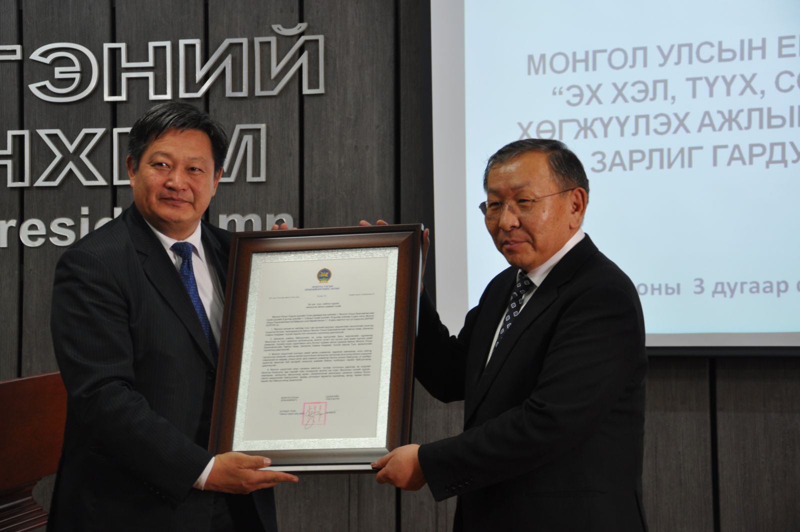 | Эх хэл, түүх, соёлоо судлах, хөгжүүлэх ажлыг дэмжих тухай зарлигийг гардуулав | ||
