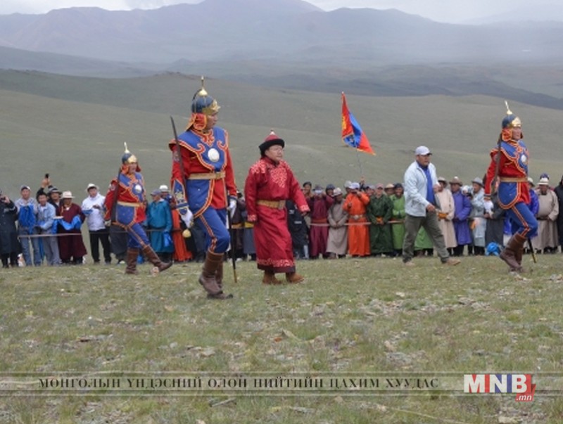 Монгол Улсын Ерөнхийлөгч "Ганжуур" их хөлгөн судраас адис авч ёслоход хүндэт харуулын цэргүүд Монгол Улсын Төрийн далбаа, Бүх цэргийн Их хар сүлдний Дорнын элч сүлд, Говь-Алтай аймгийн туг, Чингис хааны хөрөг, Төрийн долоон эрдэнийг овооны хоёр талд хүндэтгэн залж байрлуулав. Энэ үед Монгол Улсын Төрийн дуулал эгшиглэж, Монгол Улсын төрийн тэргүүн Цахиагийн Элбэгдорж хишигтэн олонд хандаж үг хэлсэн юм. Хэлсэн үгэндээ
