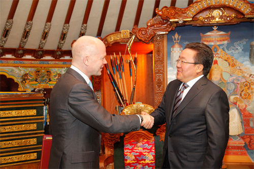 Монгол Улсын Ерөнхийлөгч Ц.Элбэгдорж Их Британийн Гадаад Хэрэг, Хамтын Нөхөрлөлийн сайд Уильям Хэйгийг Төрийн ордны Ёслол хүндэтгэлийн гэр өргөөнд өнөөдөр хүлээн авч уулзлаа. Уулзалтын эхэнд ноён Уильям Хэйг Монгол Улсын Ерөнхийлөгчид хандан хүлээн авч уулзсанд талархал илэрхийлж, төрийн тэргүүнээр хоёр дахь удаагаа сонгогдон ажиллаж буйд баяр хүргэлээ.